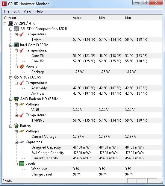 Проверить температуру особо значимых узлов устройства и констатировать именно перегрев, а не программные ошибки, можно специальными программами (например, HWMonitor). Для определения того, что ноутбук нагревается, достаточно посмотреть температуру устройства непосредственно после включения и через некоторое время (10-20 минут) интенсивного использования (например, играя в современную игру).