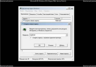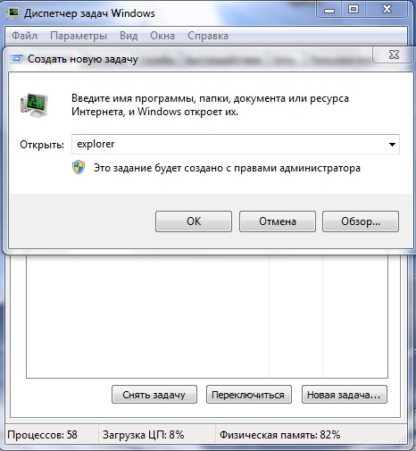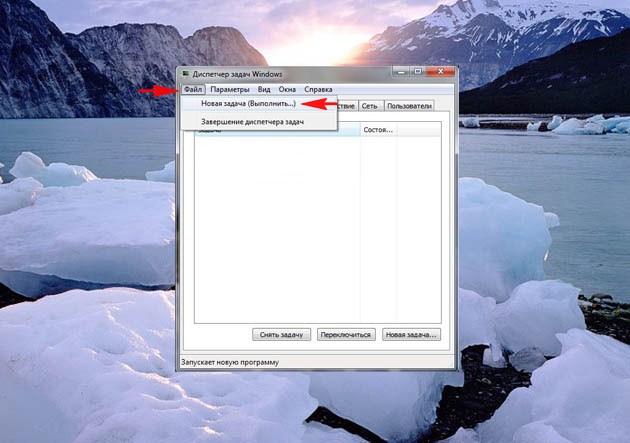 Итак, если у нас при загрузке Windows на рабочем столе пусто как в бумажнике перед зарплатой, пробуем сразу (не перезагружая компьютер) набрать клавиатурное сочетание Ctrl+Alt+Del, должен открыться Диспетчер задач, далее Файл ->Новая задача,