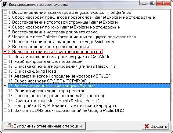 Выставляем галочки на пункте 9. Удаление отладчиков системных процессов" и 16. Восстановление ключа запуска Explorer, далее нажимаем "Выполнить отмеченные операции".