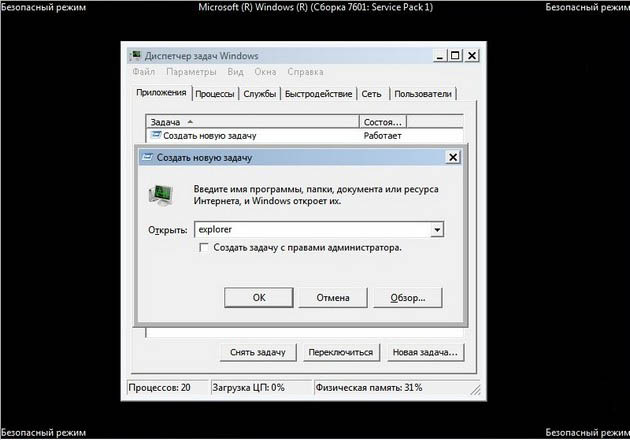 Если и в безопасном режиме также пустой рабочий стол, но восстановление системы у вас включено, тогда можно набрать Ctrl+Alt+Del, откроется Диспетчер задач, далее Файл ->Новая задача, вводим в поле ввода explorer.exe, появится рабочий стол или вводим сразу команду rstrui.exe, запустится восстановление системы, откатываемся назад и проверяем компьютер на вирусы. Ещё желательно провести восстановление системных файлов Windows.