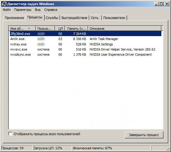 Если в это время нам удастся запустить диспетчер задач, то вместо системного процесса Explorer.exe мы увидим какой-либо вредоносный процесс, в нашем случае 2fg38m0.exe.