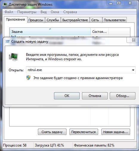 Ровно в половине случаев проблема будет решена и при следующей загрузке вы увидите свой рабочий стол, далее можно проверить систему на вирусы. Кстати, можете сразу вызвать в Диспетчере задач восстановление системы - Файл->Новая задача, вводим в поле ввода rstrui.exe, но это в Windows 7 и 8. В Windows XP нужно набрать %systemroot%\system32\restore\rstrui.exe