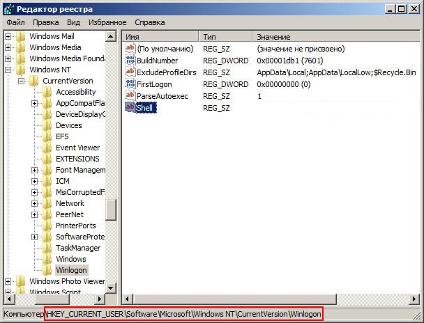 HKEY_CURRENT_USER\Software\Microsoft\Windows NT\CurrentVersion\Winlogon\ в параметре Shell прописан полный путь к вирусному файлу