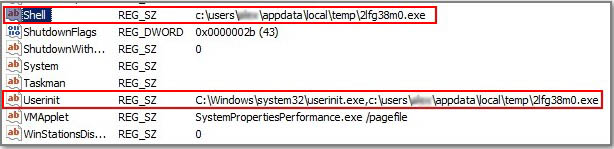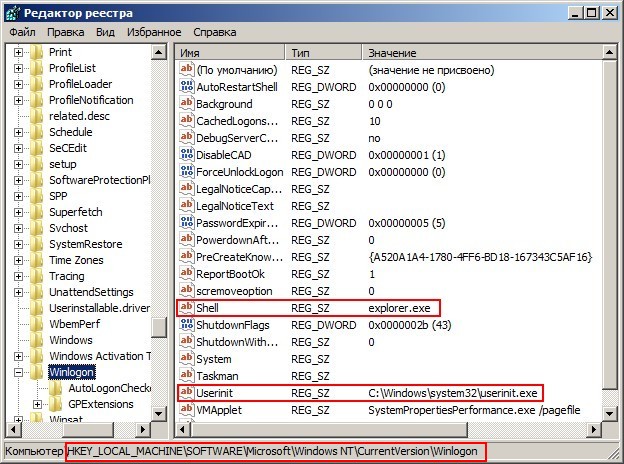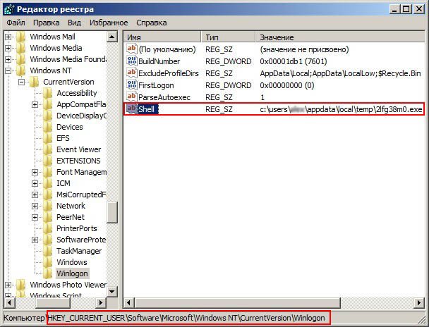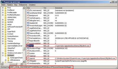 HKEY_LOCAL_MACHINE\SOFTWARE\Microsoft\Windows NT\CurrentVersion\Winlogon смотрим строчку «shell» у неё должно быть значение «explorer.exe». А в нашем случае, вместо explorer.exe стоит значение c:\users\Ваше имя пользователя\appdata\local\temp\2fg38m0.exe