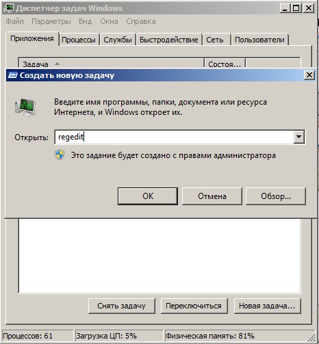 откроется реестр. Если в безопасном режиме у вас тоже будет пустой рабочий стол, тогда попробуйте клавиатурное сочетание Ctrl+Alt+Del, откроется Диспетчер задач, далее Файл ->Новая задача, вводим в поле ввода regedit.