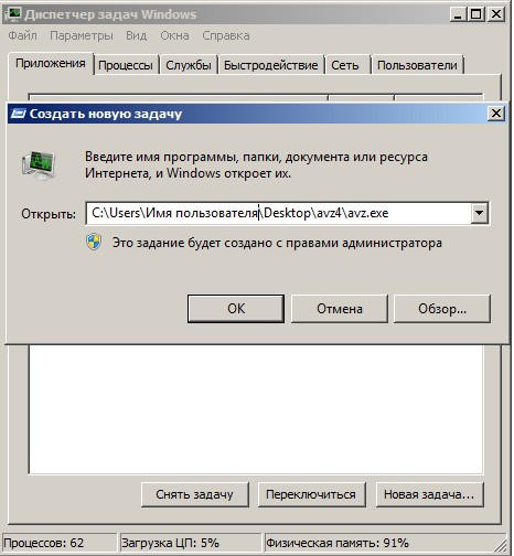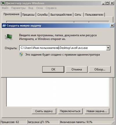 Вот здесь внимание, многие пользователи при запуске утилиты совершают ошибку. Нажимаем CRTL+ALT+DEL, появляется диспетчер задач, жмём Файл-> Новая задача, в открывшемся поле набираем полный путь до файла avz.exe. К примеру у меня файл avz.exe находится в папке C:\Users\Имя пользователя\Desktop\avz4\avz.exe