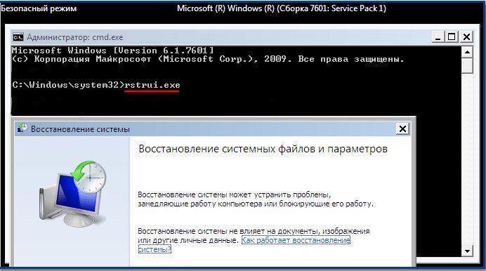 Можем сразу запустить восстановление системы командой rstrui.exe