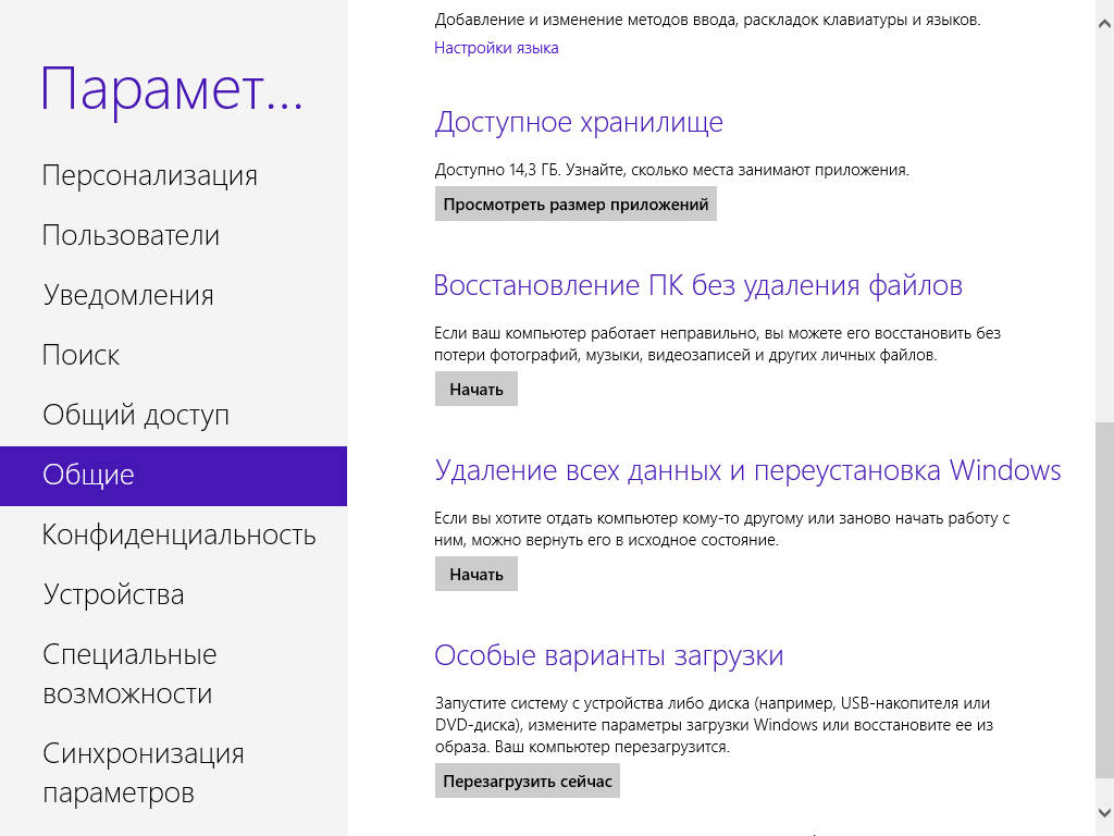 В меню «Параметры ПК» нас интересует пункт «Удаление всех данных и переустановка Windows», так обозвали Reset в русской версии восьмерки. Выбираем его и жмем «Начать».