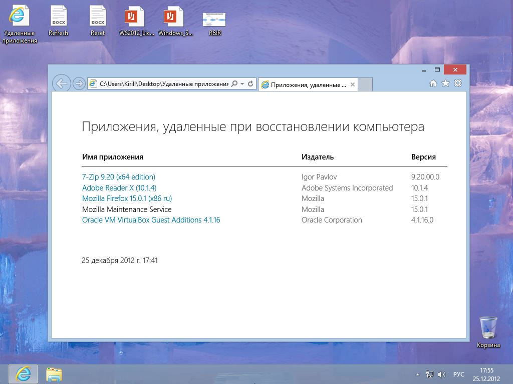 Refresh сохраняет все пользовательские данные, большинство настроек (кроме привязки файлов, параметров экрана и настроек Firewall), а также приложения Metro. Десктопные приложения (все что установлено в папку Program Files) будут удалены, а их список отображен на вашем рабочем столе в виде ссылки. Кстати, потерянные программы можно быстро скачать, т.к. для вашего удобства их названия сделаны в виде ссылок, ведущих на сайт разработчика.