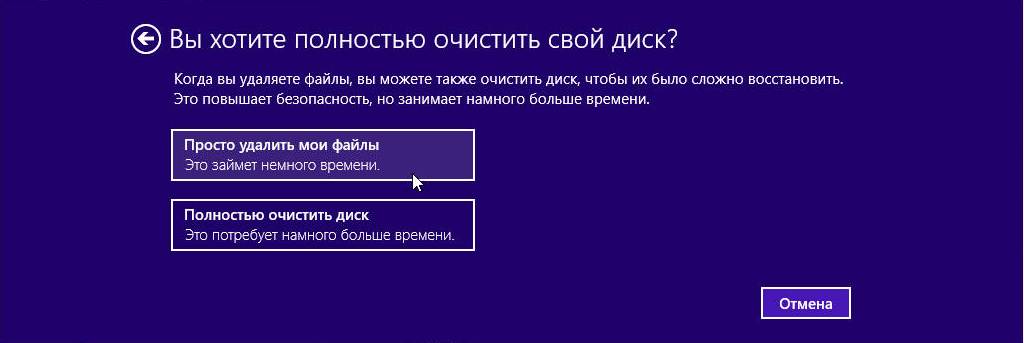 Выбираем вариант очистки диска. Можно просто удалить все файлы, а можно полностью очистить диск. При быстрой очистке некоторые данные можно восстановить с помощью специальных программ. Второй вариант занимает больше времени, однако вероятность восстановления данных после такой очистки невысока. Так сказать, вариант для секретных агентов и параноиков.
