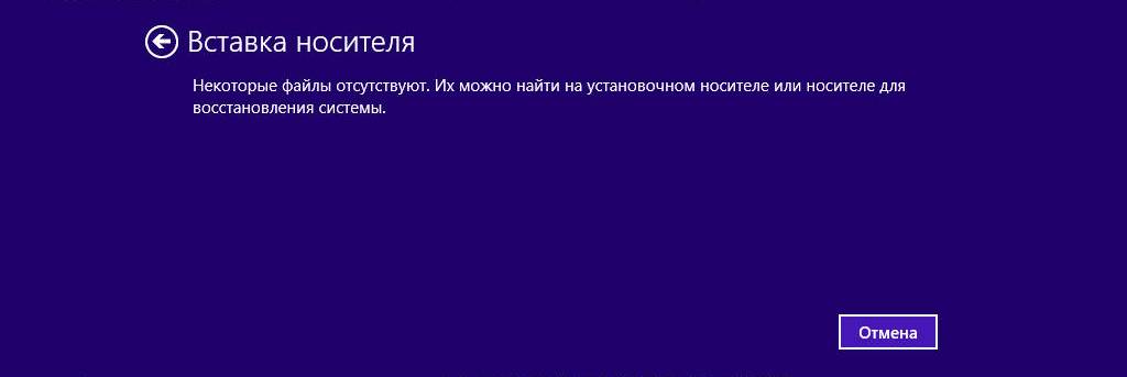 Важный момент. Для сброса и обновления требуется носитель с дистрибутивом операционной системы. Если вы забудете его вставить, то будет выдано сообщение об ошибке. Без дистрибутива продолжение процедуры сброса невозможно.