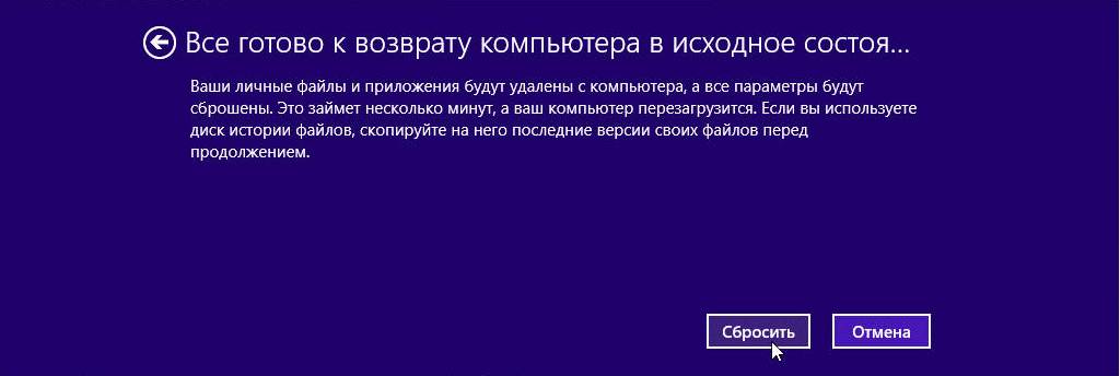 Функция Reset позволяет получить чистую установку Windows 8 без сохранения данных. Поэтому, перед запуском процедуры сброса важную информацию стоит сохранить на отдельный носитель.