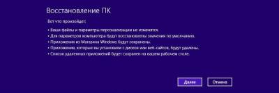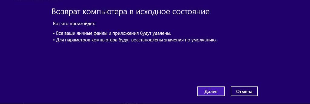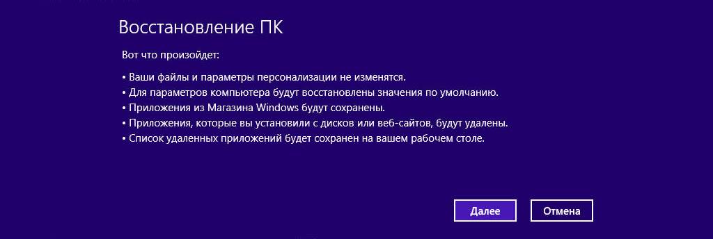 Открывается окно, в котором нас честно предупреждают о том, что произойдет с компьютером. Читаем и жмем «Далее».