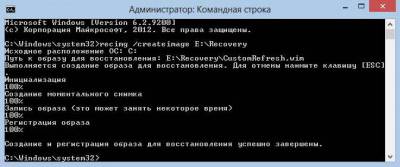 Эта команда сделает снимок системы и затем на его основе создаст файл образа CustomRefresh.wim, который положит в папку E:\Recovery. Если указанной папки нет на диске, утилита создаст ее сама.
