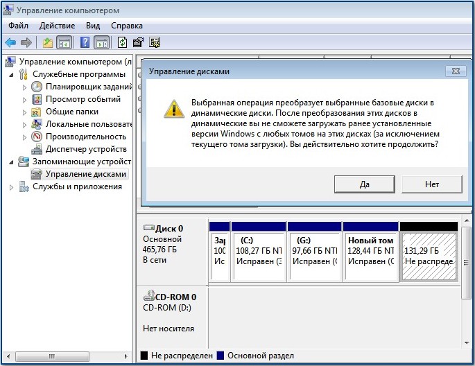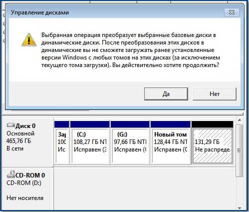 Выбранная операция преобразует данные диски в динамические. После преобразования этих дисков в динамические вы не сможете загружать ранее установленные версии Windows с любых томов на этих дисках (за исключением текущего тома загрузки). Вы действительно хотите продолжить?