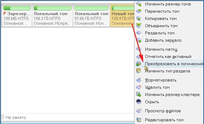 Кликаем на новом томе (128,4 ГБ) правой кнопкой мыши и выбираем преобразовать в логический.