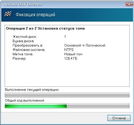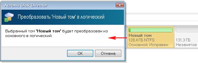 Выбираем последний основной раздел, объёмом 128,4 ГБ, желательно, что бы он был без установленной операционной системы и преобразовываем его в логический диск, одновременно создастся дополнительный раздел, в котором и будет наш созданный логический диск. Затем создадим из нашего нераспределённого пространства второй логический диск и всё.