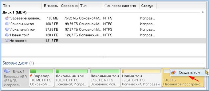 Загружаемся с диска Acronis Disk Director, в главном окне программы видим, на жёстком диске имеется четыре основных раздела, пытаемся создать пятый, кликаем правой кнопкой мыши на нераспределённом пространстве (131,3 ГБ) и выбираем создать новый том.