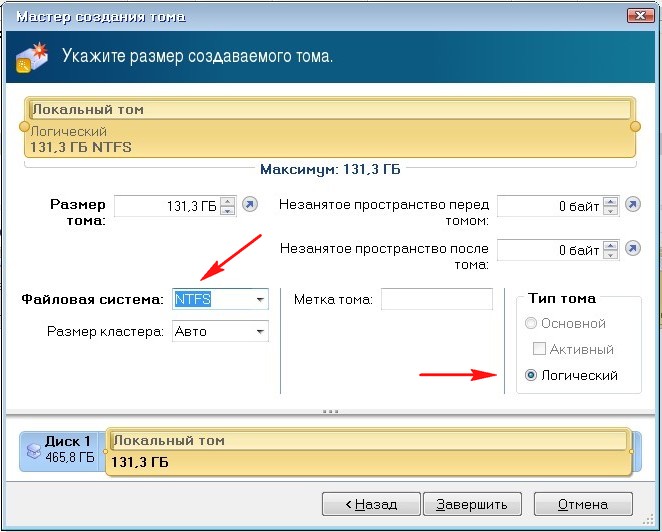 В данном окне, не забудьте указать файловую систему NTFS. Тип тома программа уже определила автоматом как логический. Далее завершить.