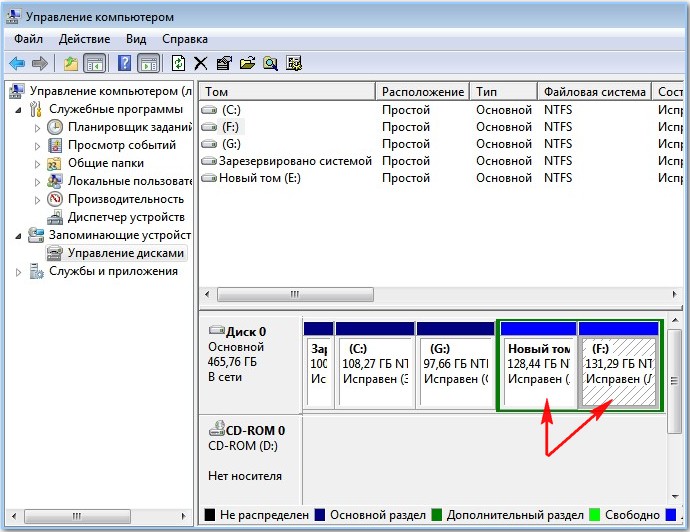Как только загружается операционная система, сразу заходим в управление дисками и видим, что у нас появился дополнительный раздел, а в нём два логических диска.