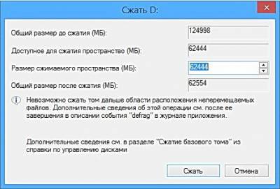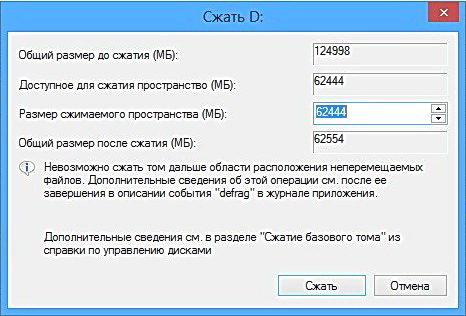 Разделим наш диск D: на два одинаковых по объёму раздела, выбираем 62 ГБ и «Сжать».