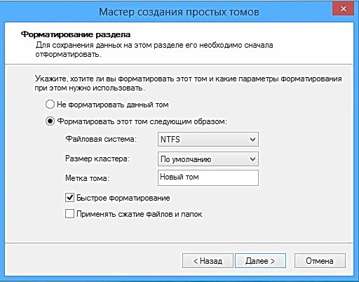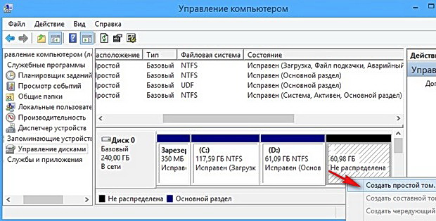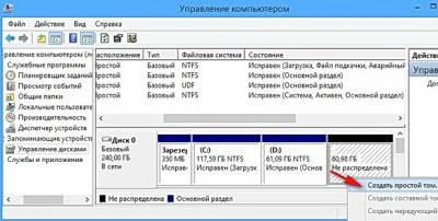 Появляется не распределённое пространство, щёлкаем на нём правой мышью и жмём создать простой том