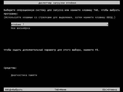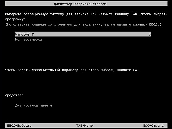 Теперь при перезагрузке и компьютера будет выходить вот такое меню, в котором мы можем выбрать для загрузки Windows 7 или Windows 8. Вот так всё просто.