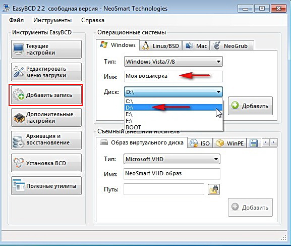 Тип: Windows Vista/7/8. Имя: выбирается произвольно, например «New System». Самый главный параметр диск:, здесь нужно указать диск с установленной операционной системой, которую мы будем вносить в диспетчер загрузки. В нашем случае Windows 8 установлена на диске D:, это значит его и выбираем - Диск: D и жмём добавить.