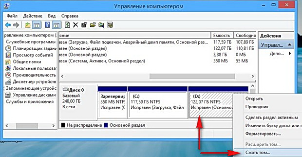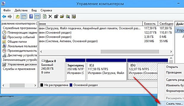 Щёлкаем на нём правой мышью и выбираем «Сжать том».
