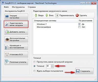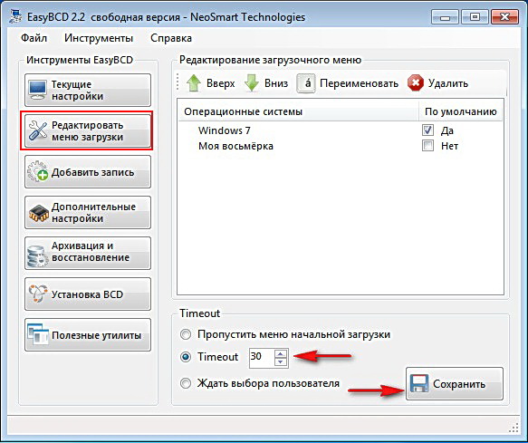 и видим, что в меню загрузки добавлена операционная система Windows 8 («New System»). Пункт Timeout 30. То есть, на раздумья, по поводу того, какую Систему загрузить, нам нужно 30 секунд. жмем сохранить.