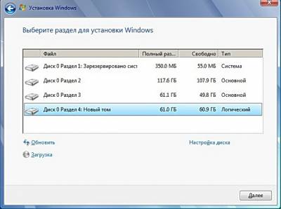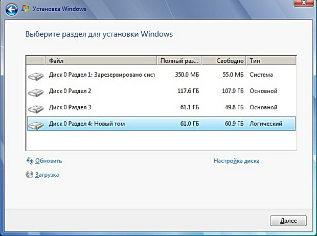 Выбираем созданный для установки Windows 7 раздел и жмём далее.