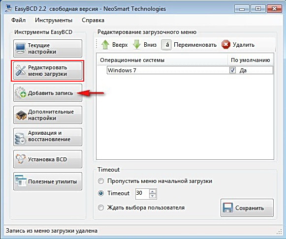 как видим в диспетчере загрузки одна операционная система Windows 7, нажимаем «Добавить запись».