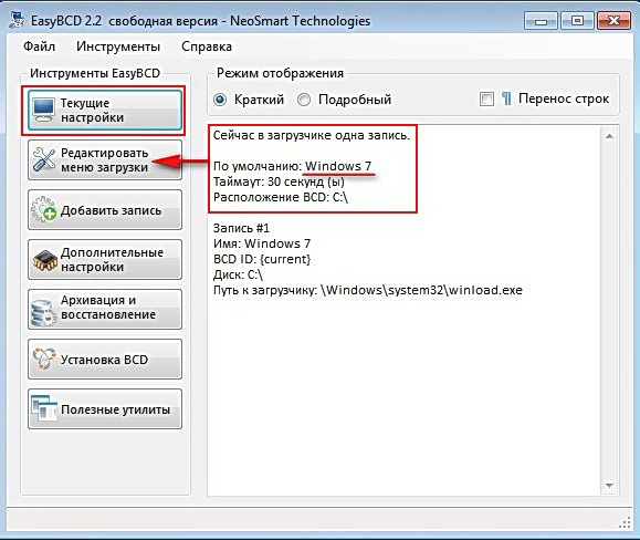 Текущие настройки: Сейчас в загрузчике одна запись. По умолчанию Windows 7 и выбираем пункт «Редактировать меню загрузки»,