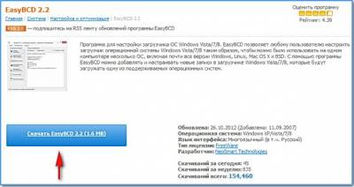 Для исправления ситуации с загрузкой Windows 8 будем использовать программу EasyBCD 2.0.2, это самый простой способ. Первым делом скачиваем эту программу.