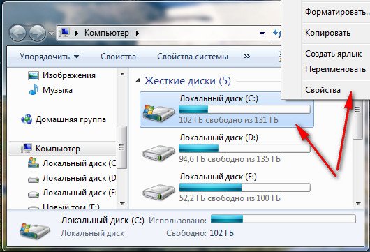 Открываем окно проводник мой компьютер и выбираем к примеру диск (C:), щёлкаем на нём правой кнопкой мыши и выбираем свойства,