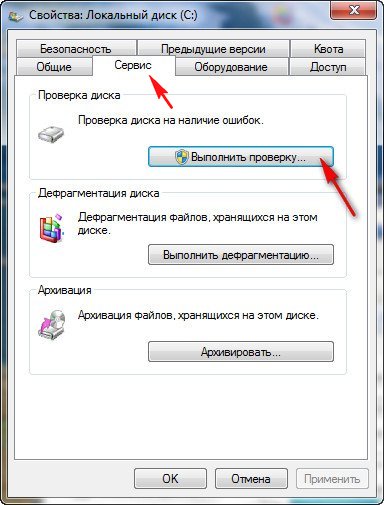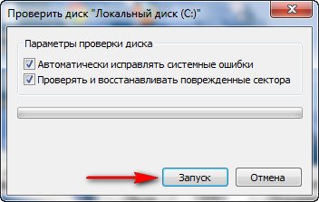 Многих пользователей это раздражает. Что бы избавиться от этого, выбираем к примеру диск (C:), щёлкаем на нём правой кнопкой мыши и выбираем свойства, затем сервис и выполнить проверку. Отметьте оба пункта автоматически исправлять системные ошибки и второй пункт проверять и восстанавливать повреждённые сектора, жмите запуск, затем перезагрузите компьютер и дождитесь проверки до конца.