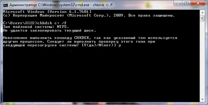 Перед нами возникнет окно с таким содержанием: "Невозможно выполнить команду Chkdsk, так как указанный том используется другим процессом. Следует ли выполнить проверку этого тома при следующей перезагрузке системы? Y(да)/N(нет)"