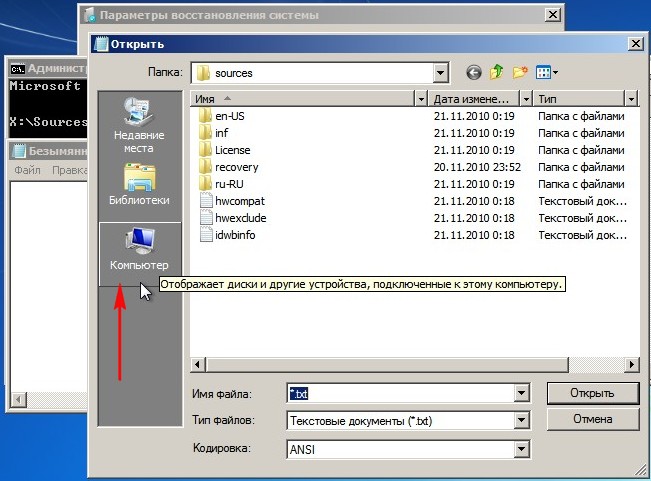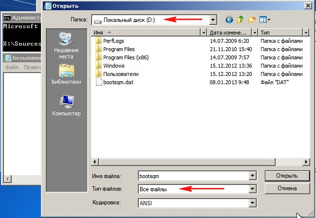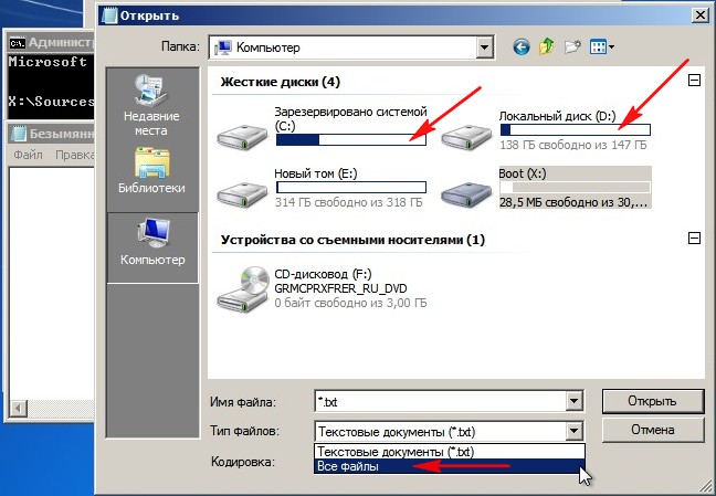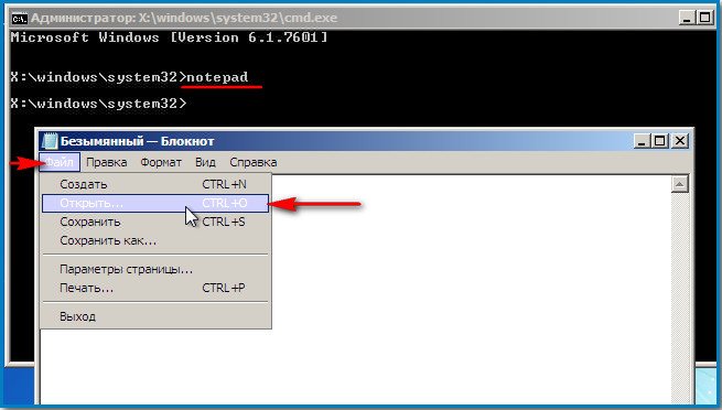 Для определения правильной буквы системного диска, в командной строке нам нужно ввести команду notepad и нажать enter, откроется блокнот, выбираем далее, выбираем меню файл и открыть.
