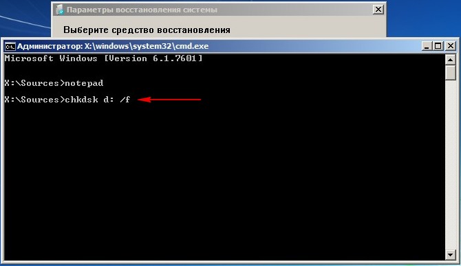 У программы chkdsk есть ещё один важный параметр /r, который применяют вместе с параметром /f, то есть :