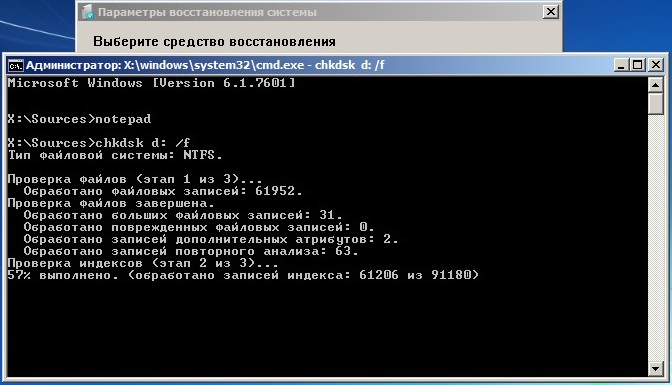 Если дело совсем плохо и chkdsk D: /f не поможет, попробуйте запустить утилиту с параметрами