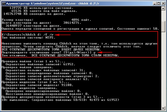 У вас может появится предупреждение "Невозможно выполнить команду Chkdsk на этом томе, т.к. том используется другим процессом. Чтобы запустить Chkdsk, вначале следует отключить этот том. ВСЕ ОТКРЫТЫЕ ДЕСКРИПТОРЫ ТОМА БУДУТ ДАЛЕЕ НЕВЕРНЫ. Подтверждение отключение тома [Y<да>/N<нет>]". Вводим латинскую букву Y и нажимаем Enter на клавиатуре. Начнётся проверка системного диска на повреждённые сектора.