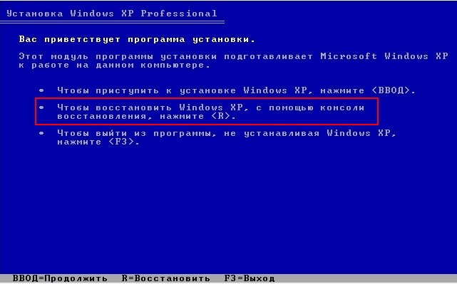 После недолгого процесса копирования файлов, появляется окно программы установки Windows XP. В нём будет предложено установить систему заново или восстановить существующую с помощью консоли восстановления (нажмите R). Выбираем Восстановить с помощью консоли восстановления и жмём «R»