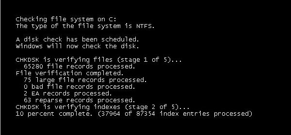 Начинается проверка системного диска на ошибки файловой системы.