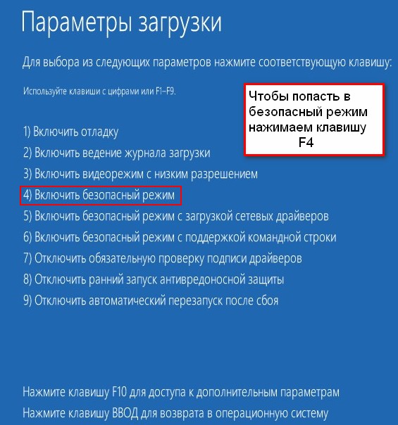 Откроются параметры загрузки. Используйте клавиши с цифрами F1-F9, то есть, чтобы попасть в безопасный режим нам нужно нажать клавишу F4