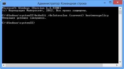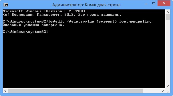 bcdedit /deletevalue {current} bootmenupolicy