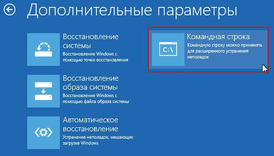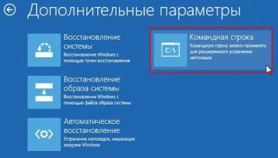 Как видим, при загрузке с диска восстановления, уже знакомые нам Параметры загрузки отсутствуют. Выбираем командную строку. Вводим: