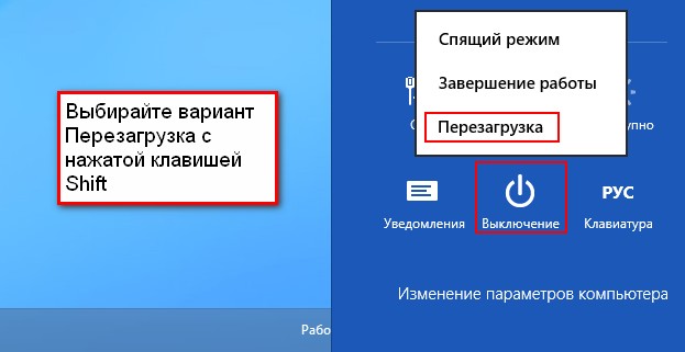 Если Ваша Windows 8 нормально загружается, но вам по каким-то причинам нужно войти в безопасный режим, делаем так. При нажатой клавише Shift, выбираем пункт Перезагрузка,