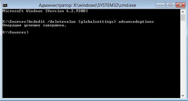 При желании всё отменить и вернуться в новое меню загрузки, в командной строке от имени администратора вводим команду: